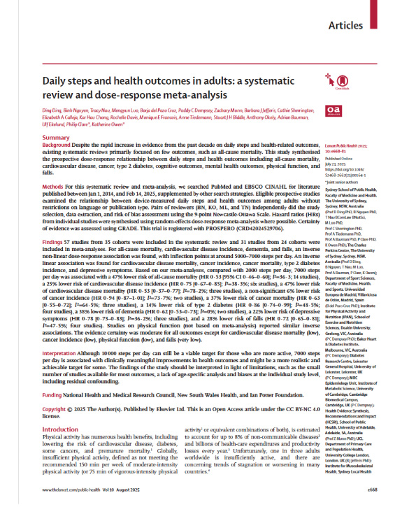 The 7000 Steps paper, a systematic review and meta-analysis of 57 studies, found strong associations between daily step counts and improved health outcomes across multiple systems.