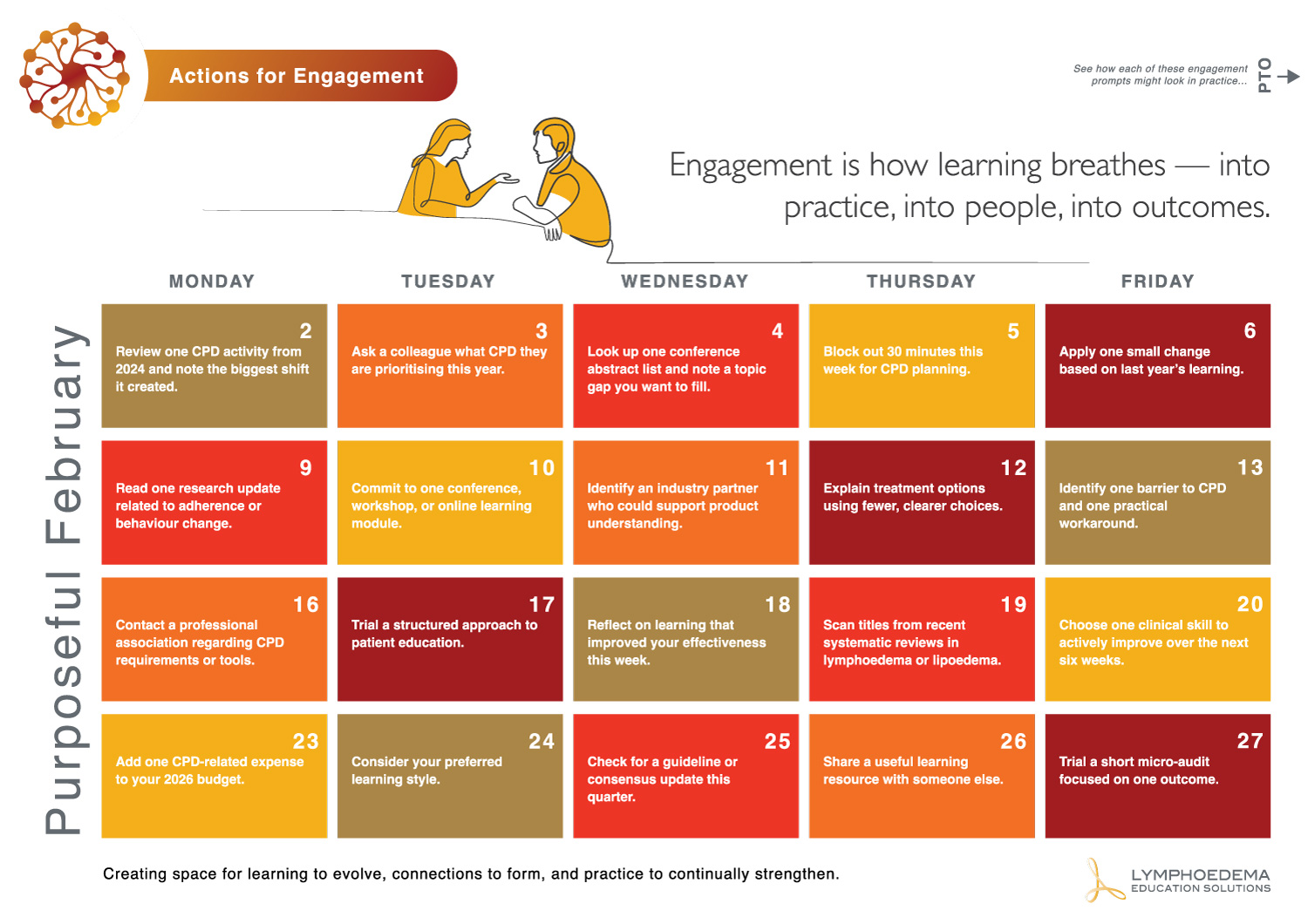 - Check back monthly as the calendar page is updated regularly with a new calendar to download and consider – lymphoedemaedu.com/engagement